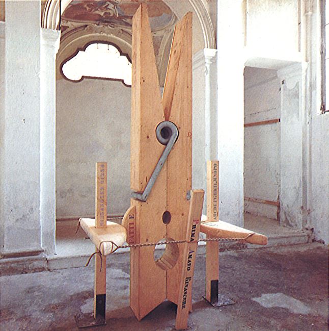 L’enorme molletta non fissa bianchi teli di bucato al vento, ma stringe il vuoto, in un impossibile tentativo di tenere ferma, di “tenere per ferma” la realtà: un grado zero di rappresentazione, una sorta di irriverente monumento alla inutilità rappresentativa dell’arte.