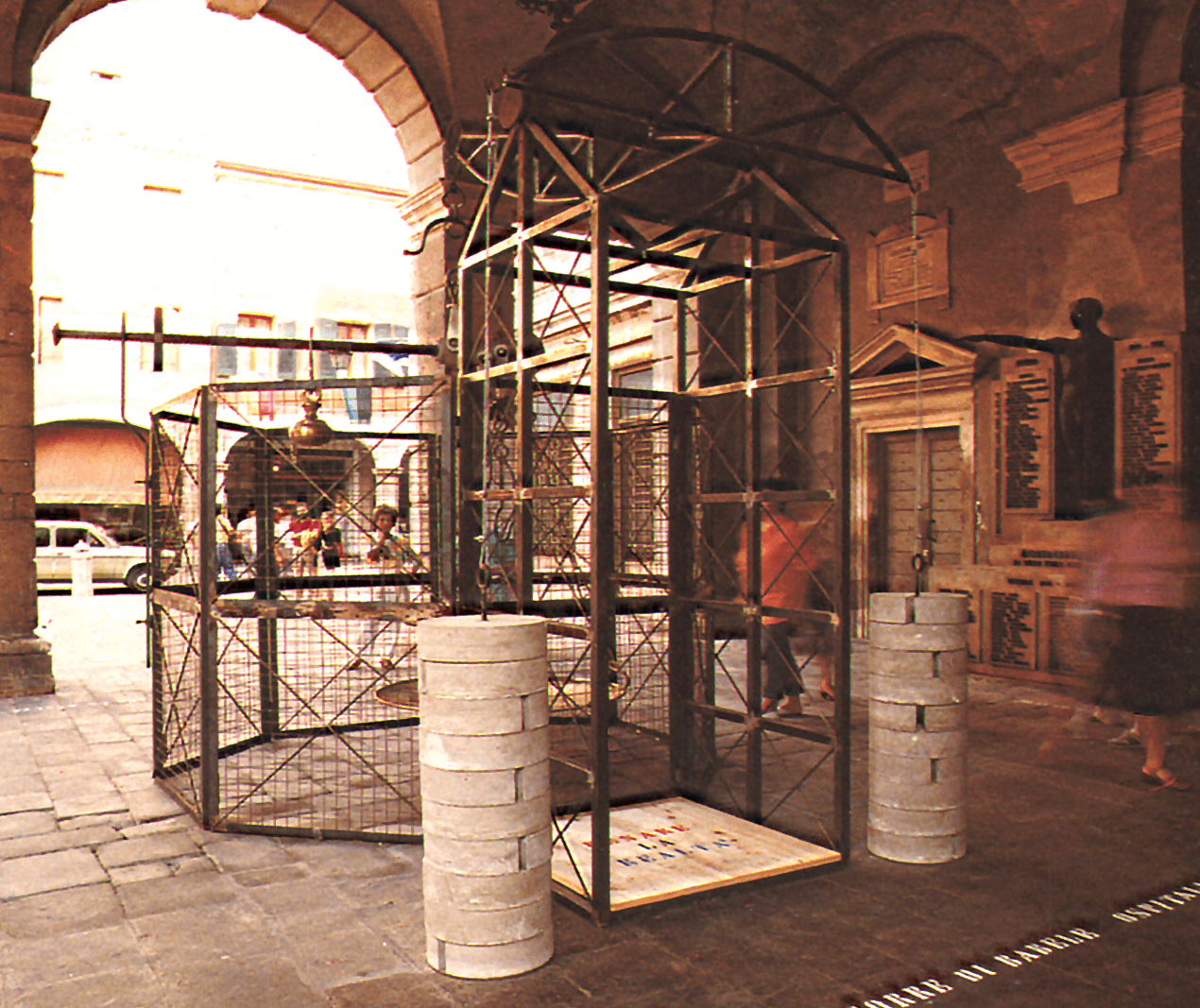 Per ciò l’installazione, una lignea complicata architettura, ne sottolinea l’aspetto minaccioso, di macchina da tortura: da strumento neutrale di misurazione del bene e del male questo utensile della giustizia sembra aver già stabilito il destino del condannato e riassume nello stesso atto del giudizio anche la condanna ed il peso della pena.